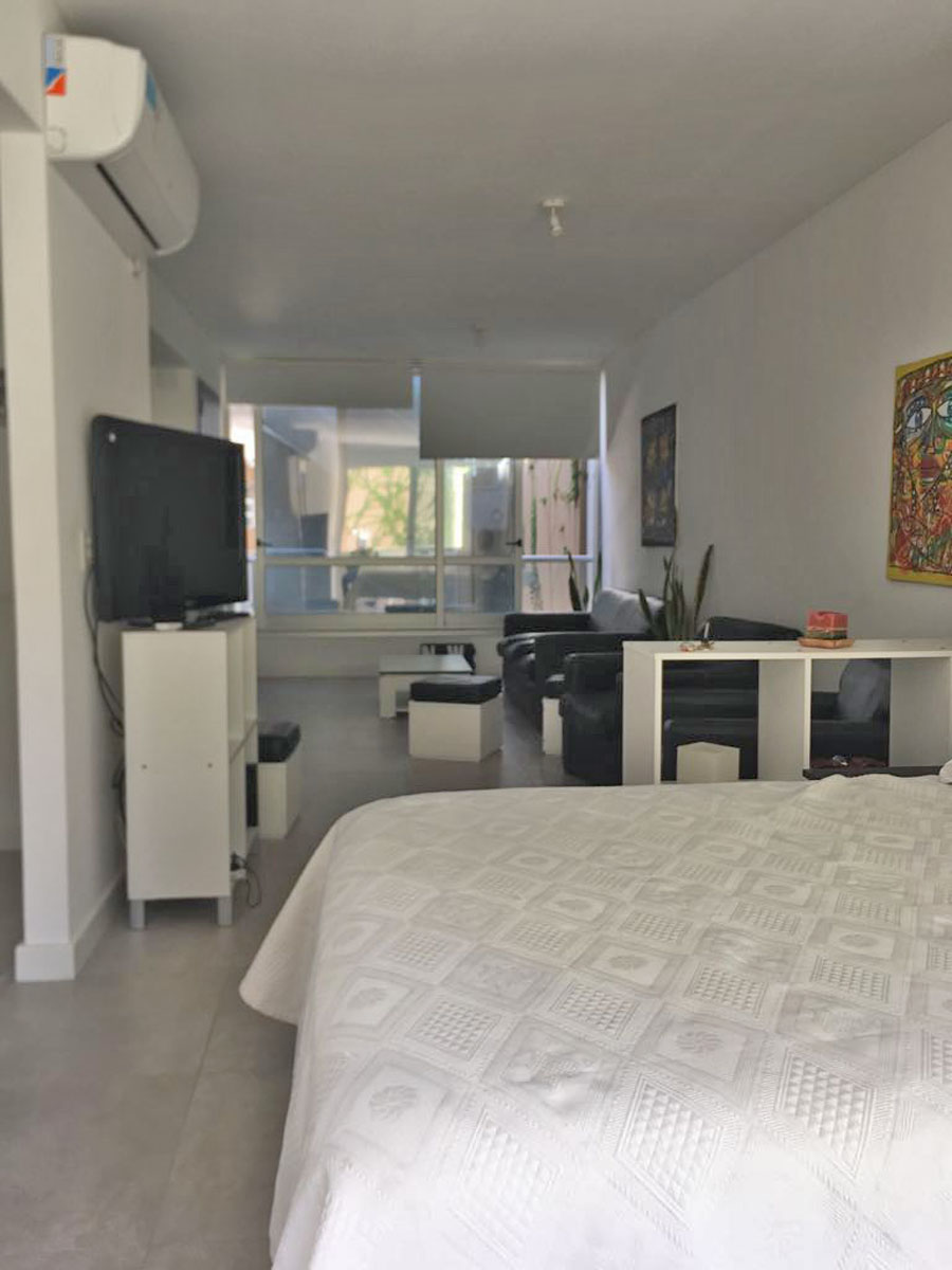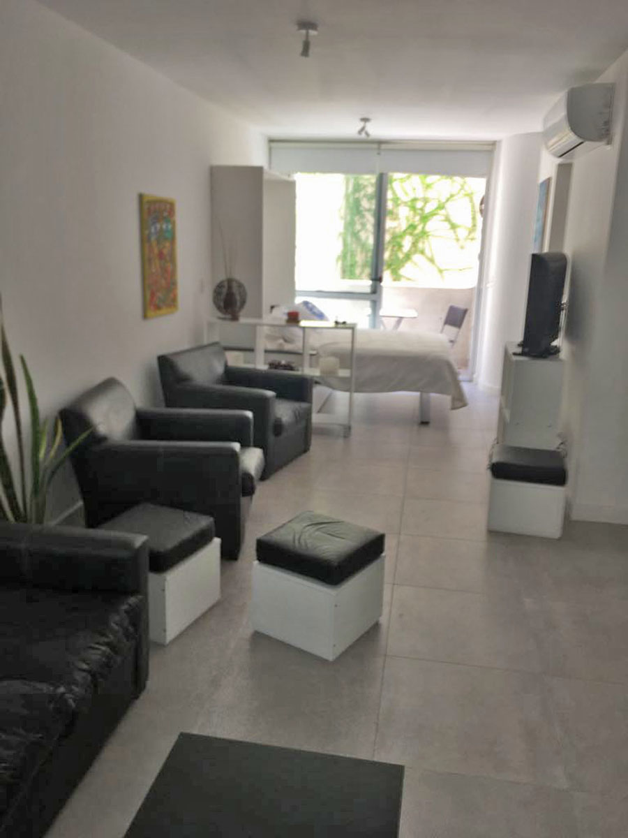 Amplio monoambiente en calle Arevalo al 2800, en el barrio de Palermo. Es un 1° piso al contrafrente. Dpto totalmente equipado a estrenar en un edificio moderno que cuenta con amenities. Amoblado con mesa con 4 sillas, cama doble (posibilidad de agregar una cama single), televisor lcd, sillones y mesa ratona, aire acondicionado. El edifcio cuenta con pileta en la terraza. Alquiler mensual $26.000, con todos los servicios incluidos